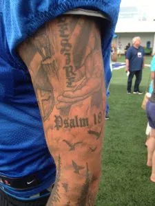 I noticed the tattoo on his left arm and asked him about it. It’s of Psalm 18, a chapter in the bible. The artwork is a description of verses 31-35, Abbrederis said.