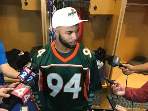 A fan of Miami while growing up, Tate ordered the Hurricanes jersey off of EBAY, he said. And as for what he will do with it after today, he says he’s unsure at the moment.