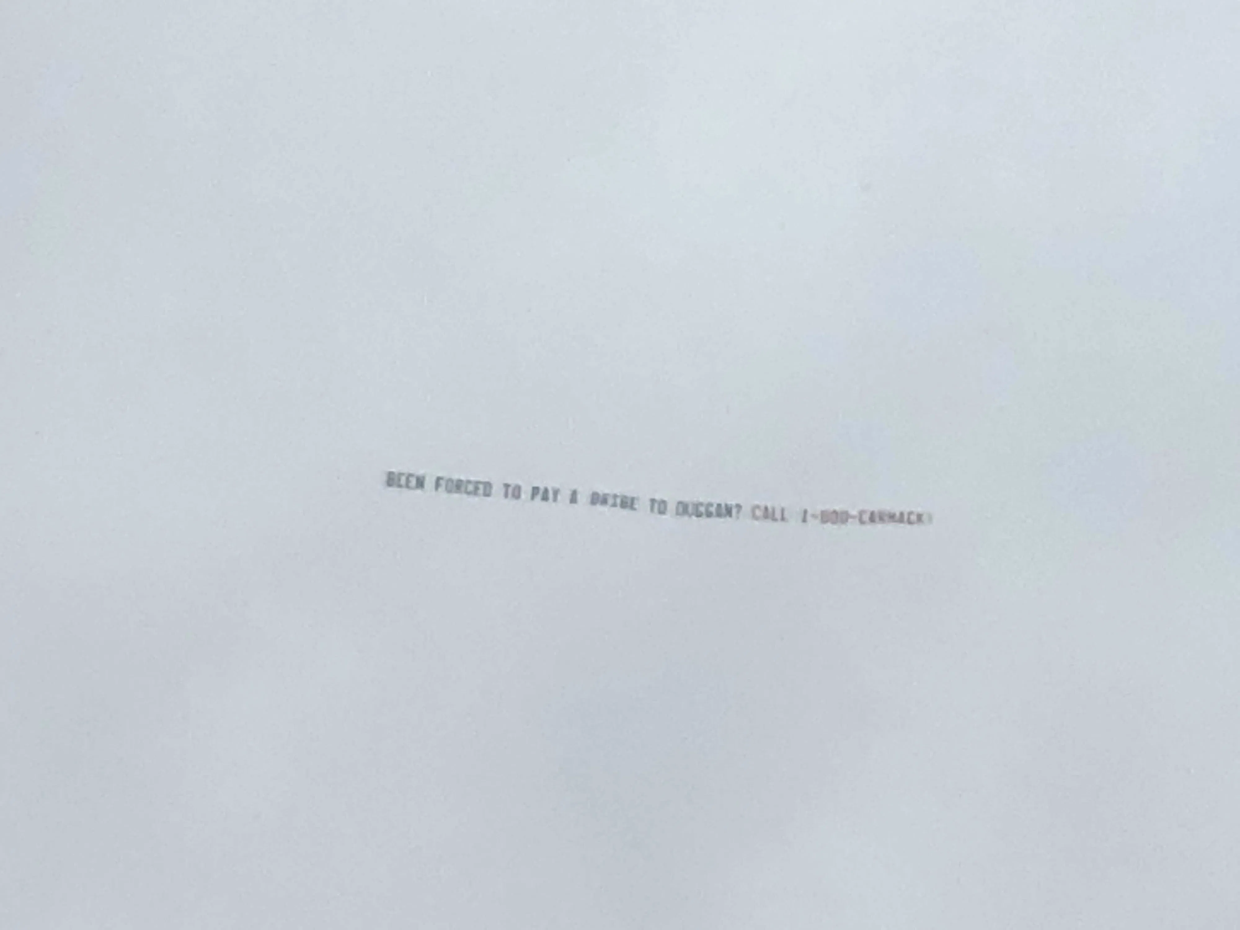 One of the banners mentions bribes. Another has the name of a person alleged by businessman Robert Carmack to have had a relationship with Duggan. The banner that has the word ‘bribe’ also displays an 800 phone number. The phone number is that of a California business that appears to have no connection with Robert Carmack.
