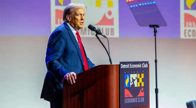 DETROIT, Oct. 11, 2024 ~ In a charged speech at the MotorCity Casino Hotel Thursday, former President Donald Trump warned the Detroit Economic Club about the potential consequences of Vice President Kamala Harris’ leadership.