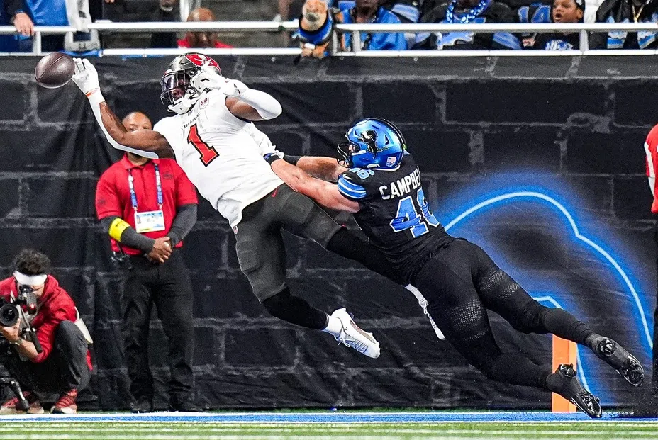 Oct. 21, 2025 ~ The Detroit Lions (5-2) came into Monday Night Football against the Tampa Bay Buccaneers (5-2) with only one starting defensive back due to various injuries. Despite this, Detroit forced two turnovers and only allowed one touchdown in the 24-9 win. Running back Jahmyr Gibbs carried the load on offense, tallying 218 total yards and two rushing scores.