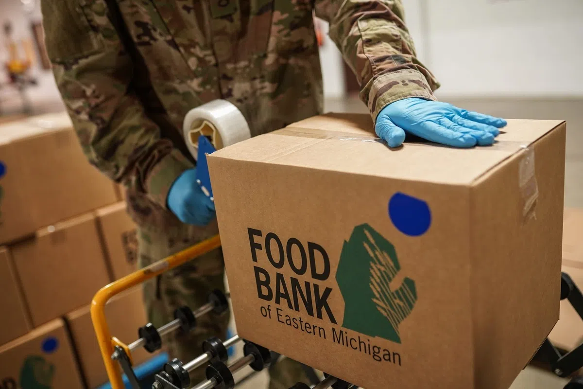 Michigan National Guard PFC Zachary Lucian tapes emergency food boxes shut at the Food Bank of Eastern Michigan Hunger Solution Center in Flint on Tuesday, March 31, 2020. The National Guard members are helping at several of the Food Bank Council of Michigan's seven regional food banks to cover fewer volunteers due to the stay-at-home executive order. The boxes, that feed 2-4 people, are to be distributed to 22 counties for drive-thru pickup. Photo: Ryan Garza ~ USA TODAY NETWORK