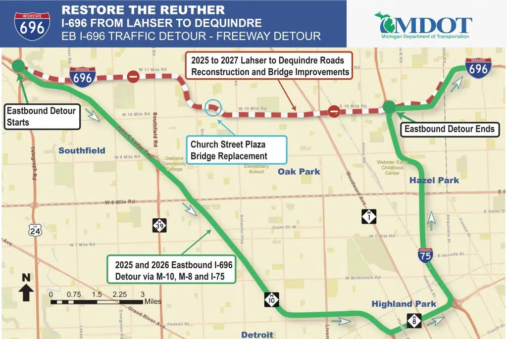 METRO DETROIT ~ Westbound I-696 will be shut down from I-75 to Telegraph Road due to the next phase of road work starting on the freeway. Westbound traffic was shifted to the recently completed eastbound side of the freeway over the weekend and will see five exit ramps closed during construction, which is expected to be completed by fall of 2026.