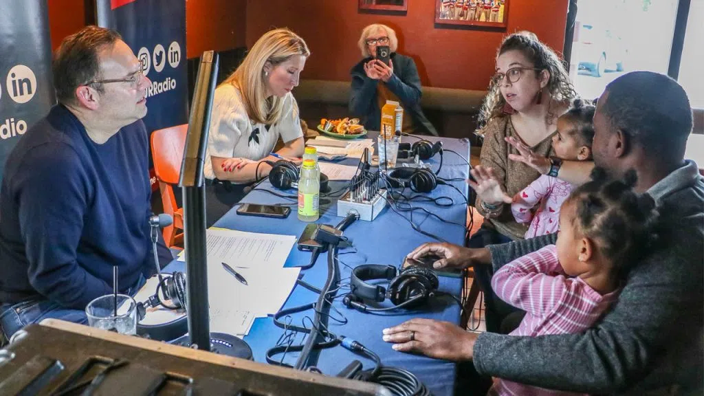 Dec. 12, 2025 ~ Ryan Ermanni and Jamie Edmonds welcome the Stankevich Family of Swartz Creek, Michigan, during the Christmas On Us broadcast. Master Sergeant Stankevich and his family received some gifts from WJR and its sponsors.