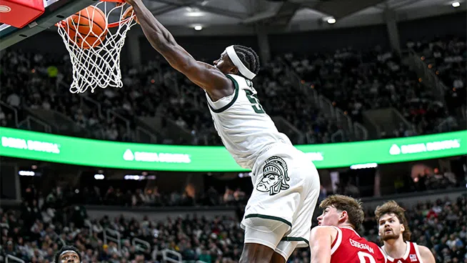 Photo: David Banks ~ IMAGN IMAGESEAST LANSING, Jan. 12, 2025 ~ #16 Michigan State basketball (14-2) got off to a 23-point lead near the end of the first half and didn't look back, pushing to a 78-68 w...