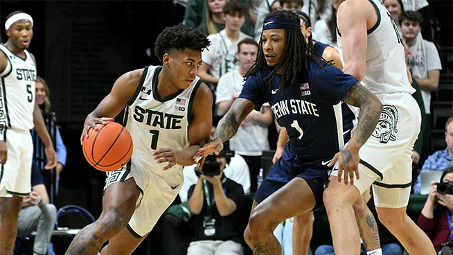 Photo: Dale Young ~ IMAGN IMAGESEAST LANSING, Jan. 15, 2025 ~ #12 Michigan State basketball (15-2) held off a hot shooting second half from Penn State (12-6) to take a 90-85 victory at the Breslin Cen...
