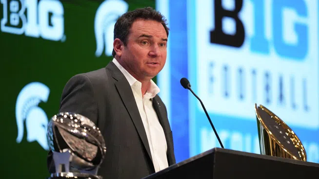Photo: Lucas Peltier ~ USA TODAY NETWORKLAS VEGAS, July 25, 2025 ~ Michigan State Head Coach Jonathan Smith addressed the media Friday at Big Ten Media Days, emphasizing roster continuity, player deve...