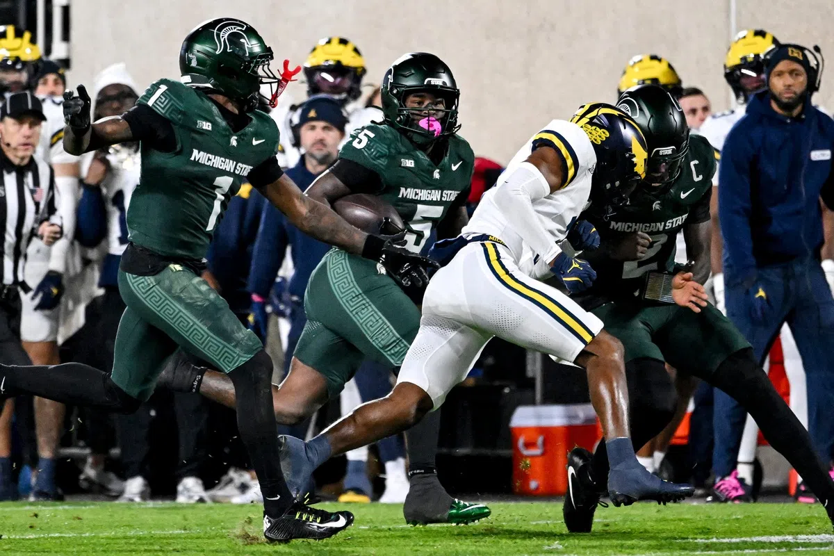 Nic Fardella Oct 26, 2025 Michigan State's Makhi Frazier, center, runs for a big gain during the second quarter in the game against Michigan on Saturday, Oct. 25, 2025, at Spartan Stadium in East Lansing.